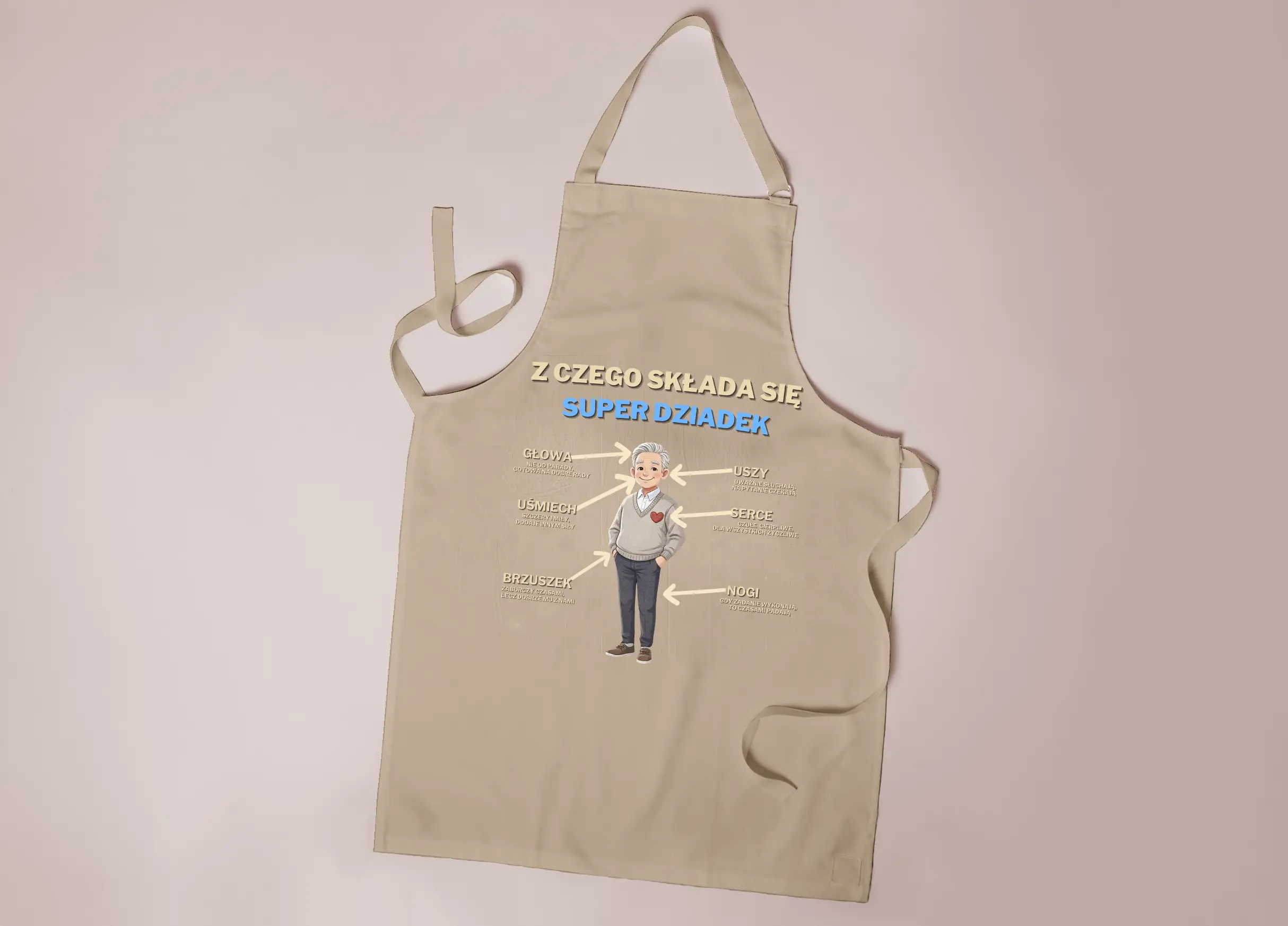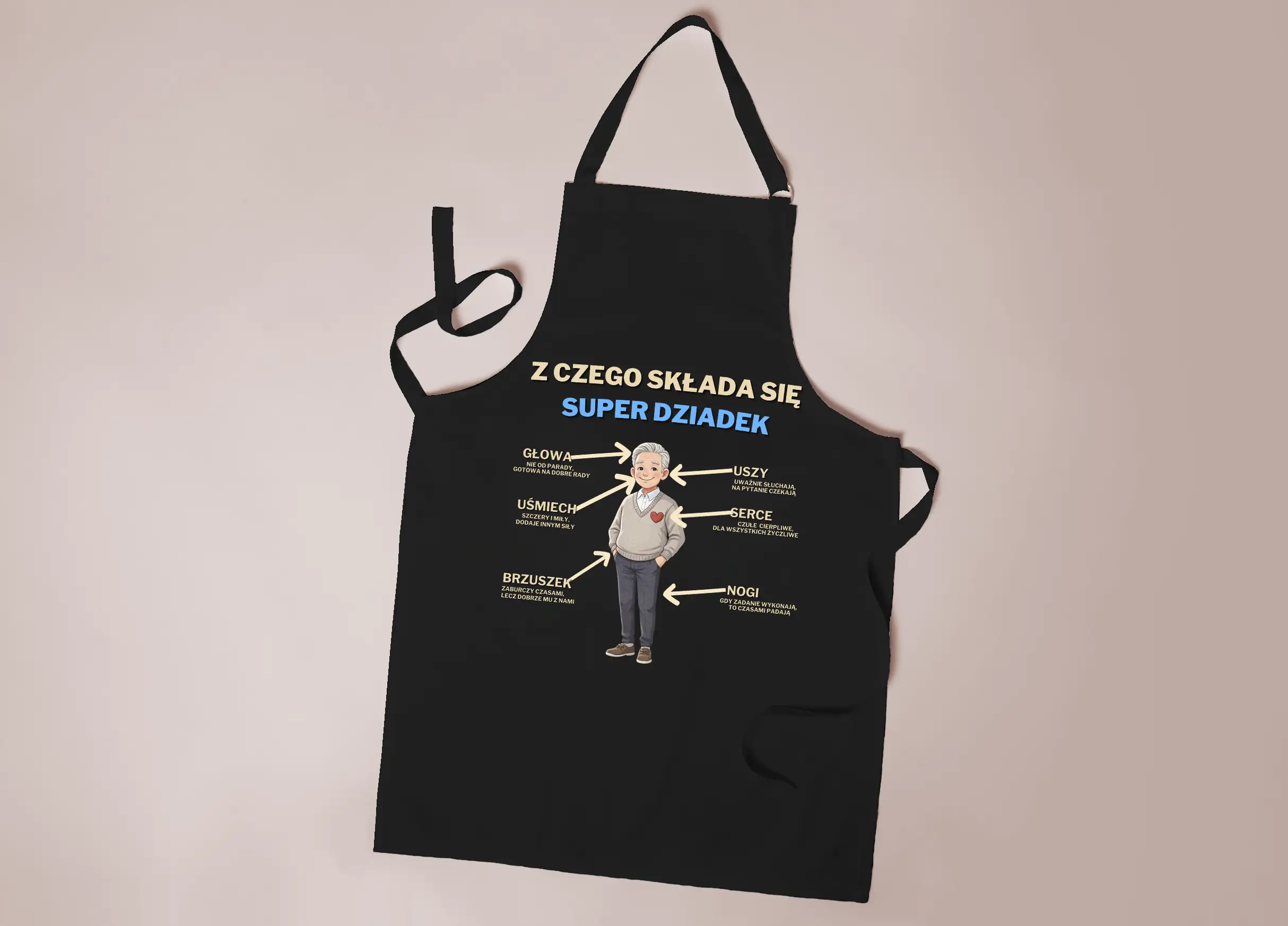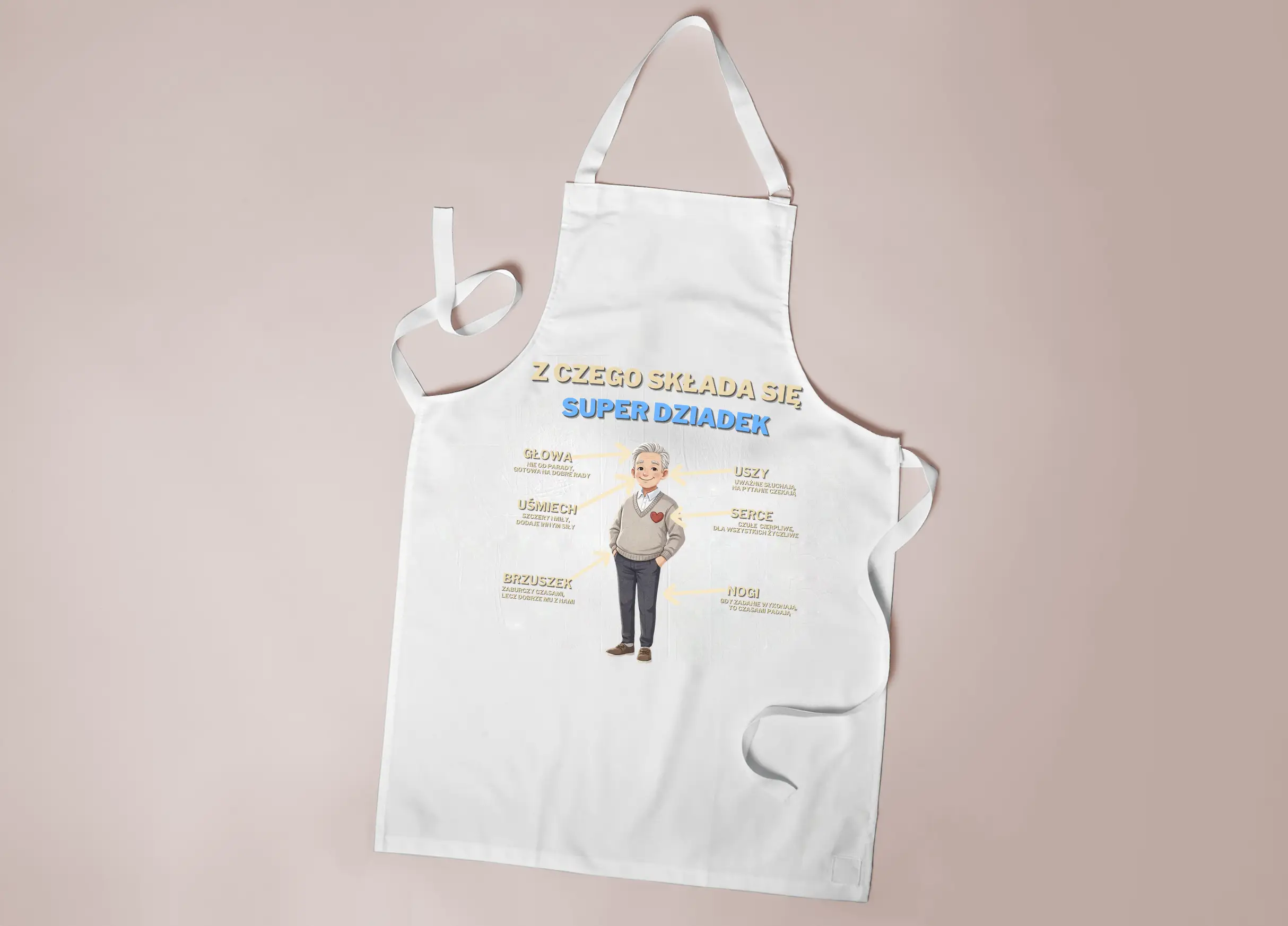 Ten fartuch to zabawna rozpiska wszystkiego, co czyni dziadka wyjątkowym: uśmiechu, serca, doświadczenia i… solidnego brzucha 😉 Całość podana w lekkiej, humorystycznej formie, która od razu wywołuje uśmiech.