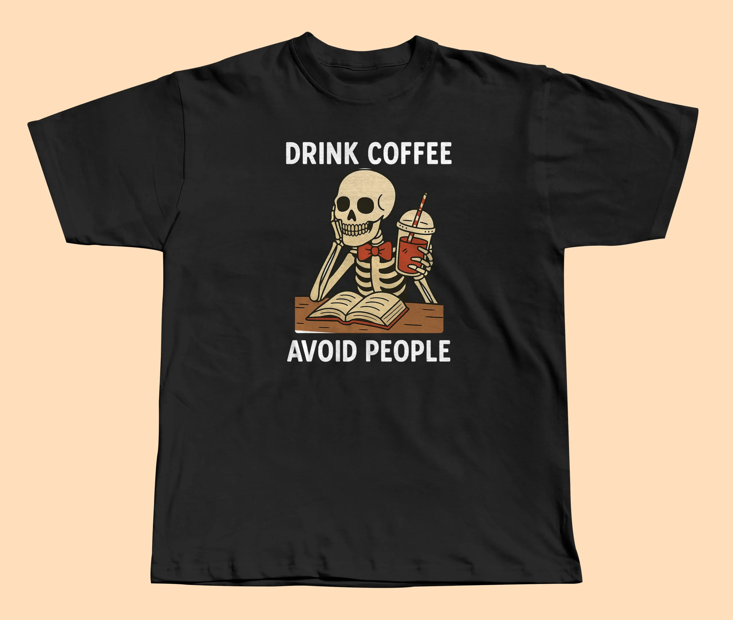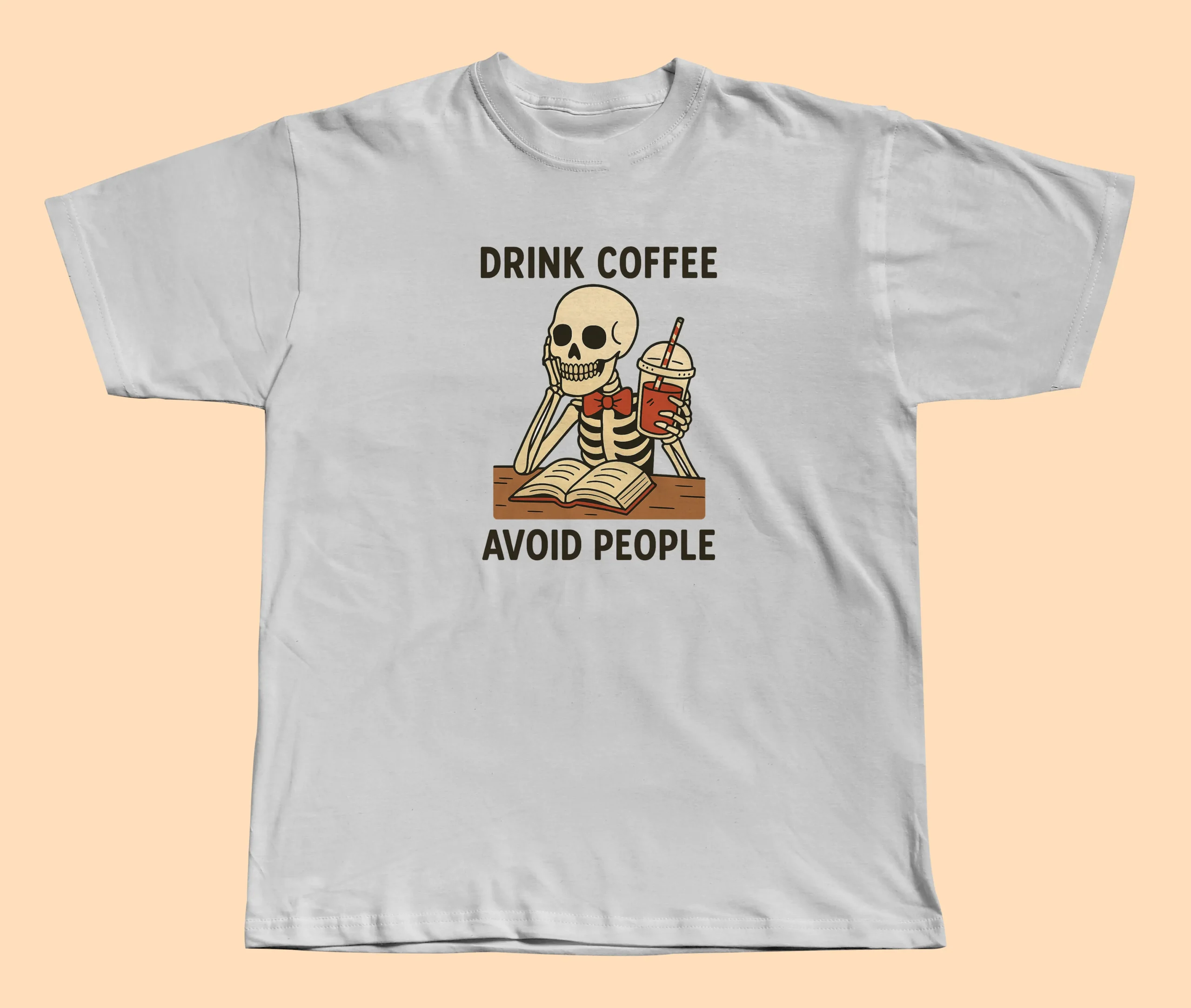 Koszulka „Drink Coffee, Avoid People” to idealny wybór dla tych, którzy najlepiej funkcjonują z kubkiem kawy w dłoni i bez zbędnych rozmów dookoła. Humorystyczny nadruk szkieletu z kawą i książką idealnie oddaje poranny nastrój wielu z nas.
