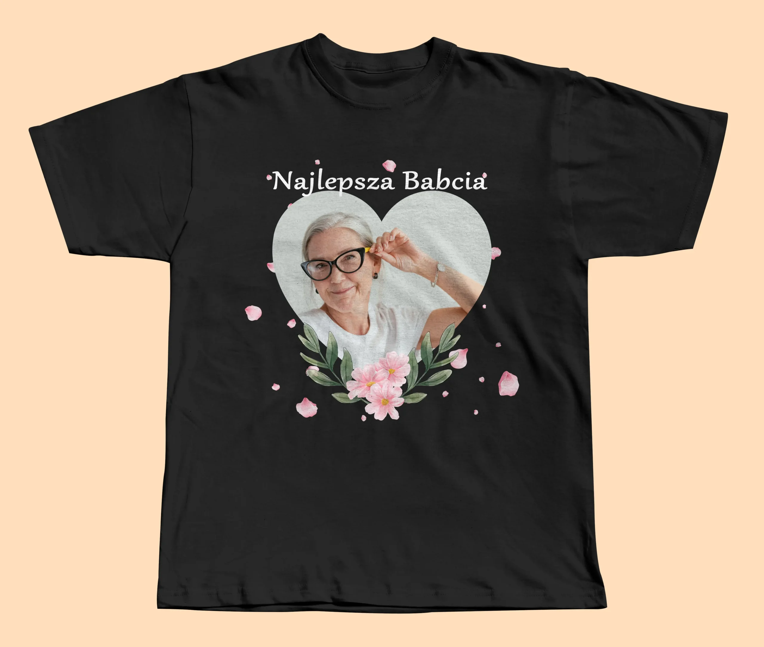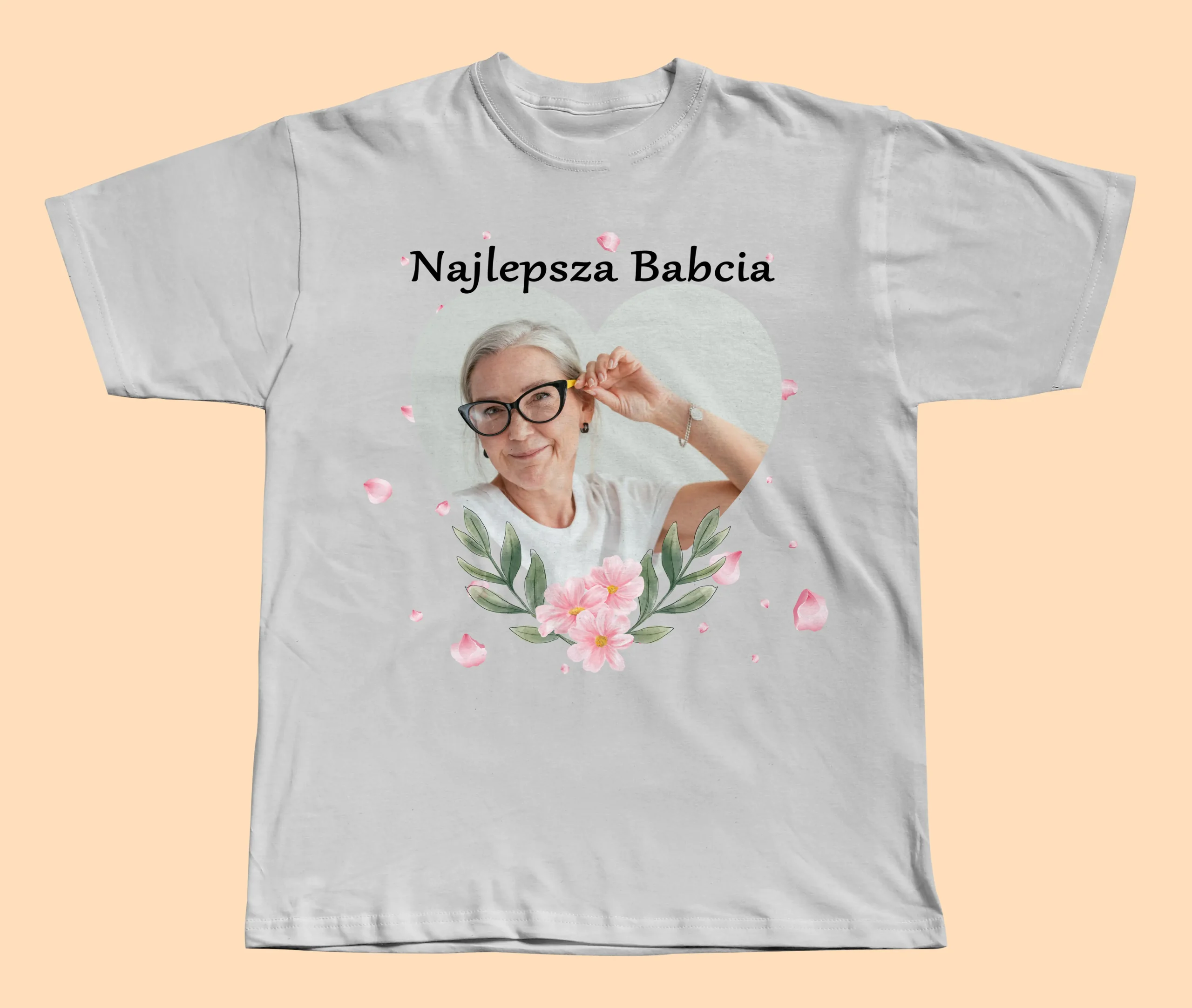 To spersonalizowana koszulka z napisem „Najlepsza Babcia” i własnym zdjęciem, tworzona indywidualnie na zamówienie przez Szopik Print.