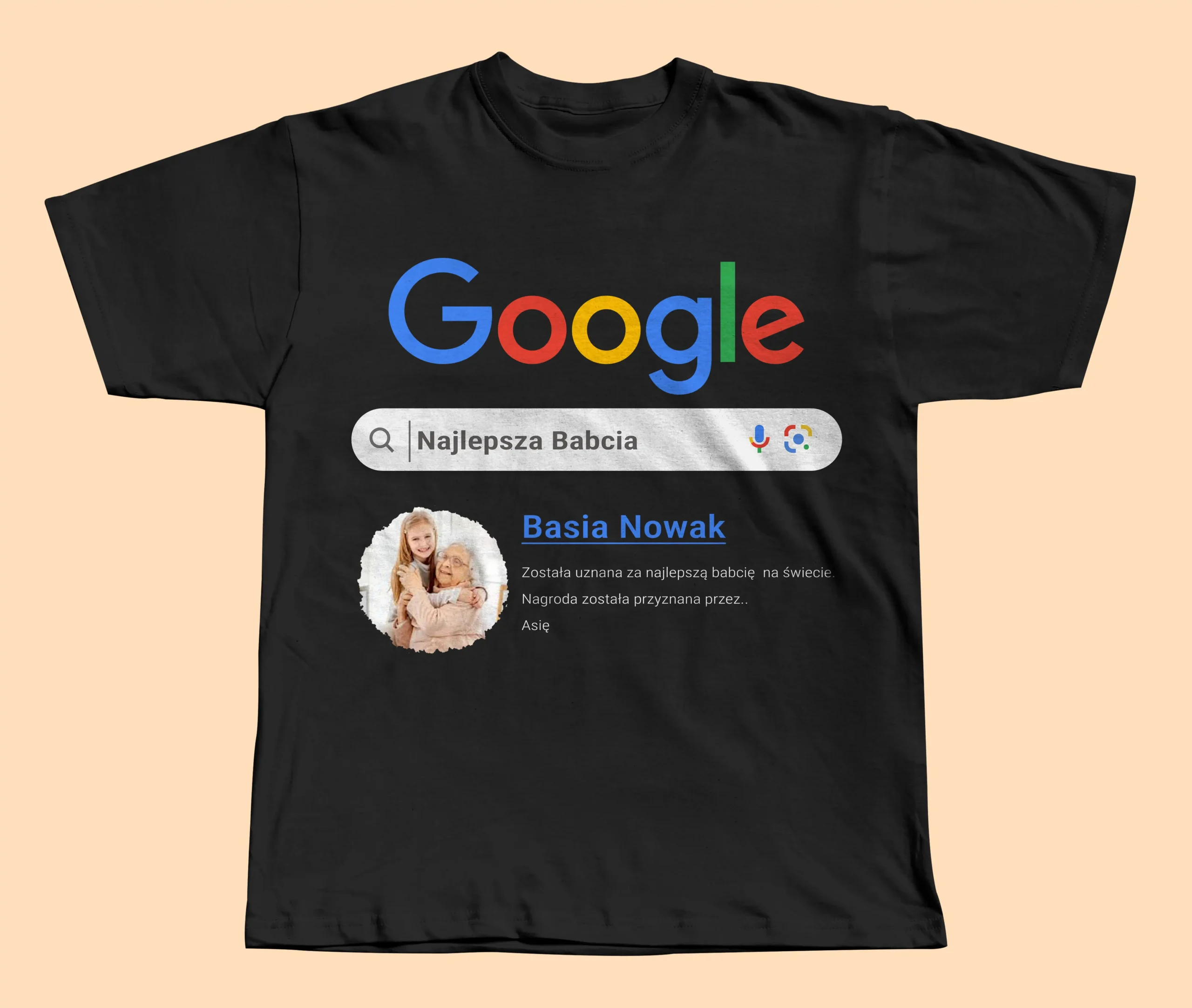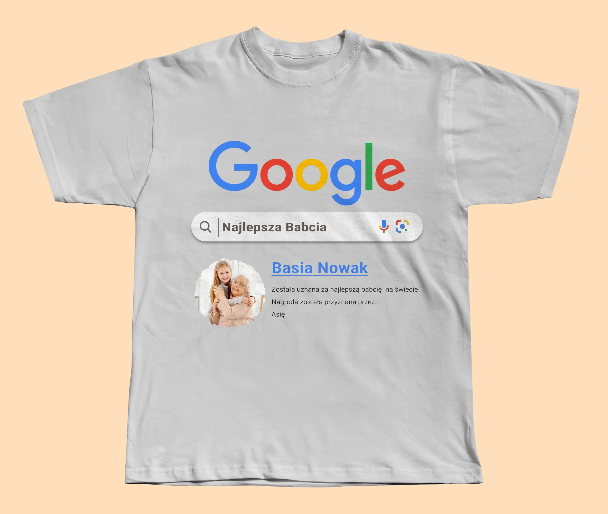 To koszulka dla Babci z własnym zdjęciem, imieniem oraz krótkim opisem, zaprojektowana w stylu wyników wyszukiwania. Projekt jest personalizowany i przygotowywany specjalnie dla Ciebie.