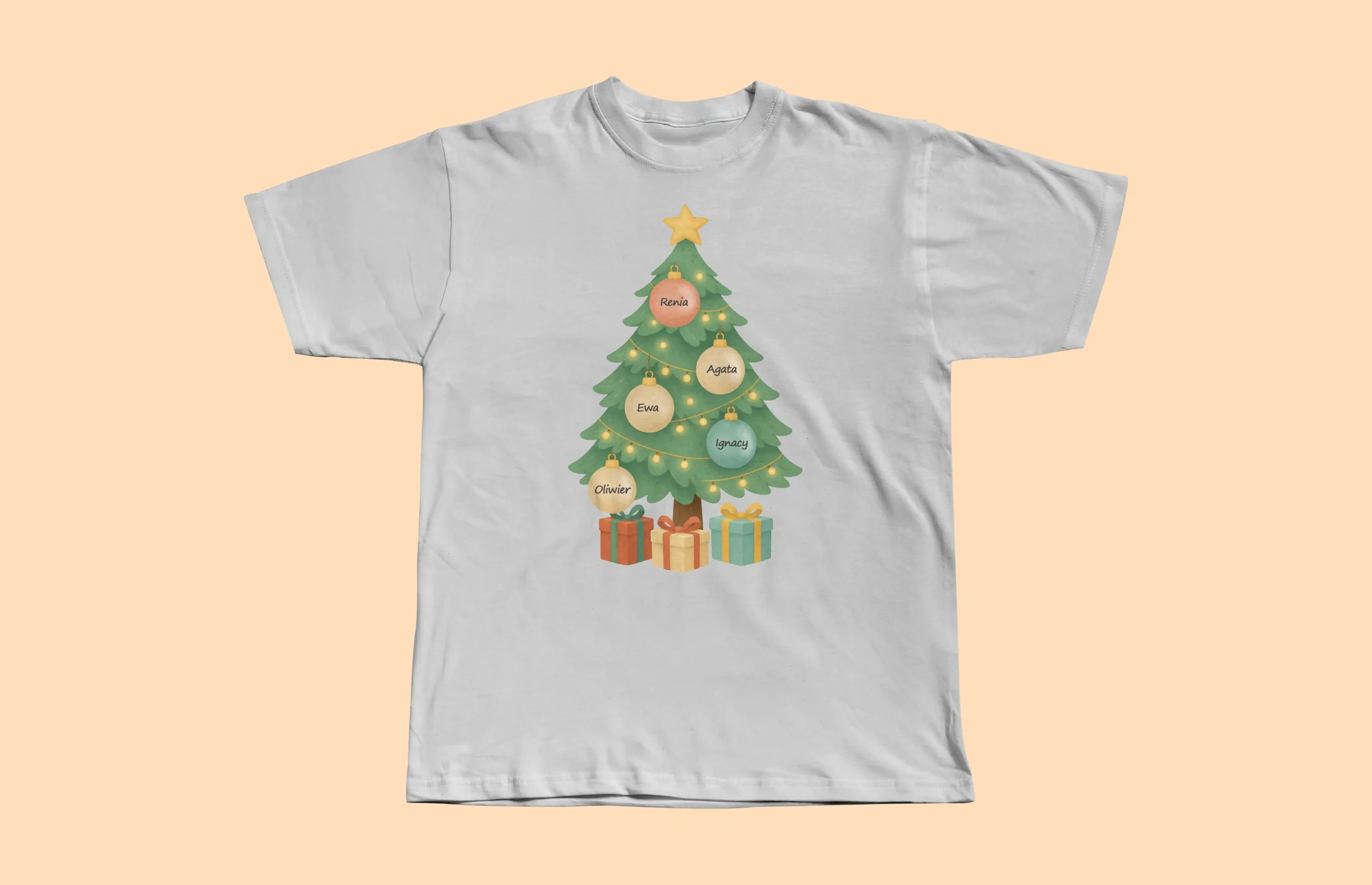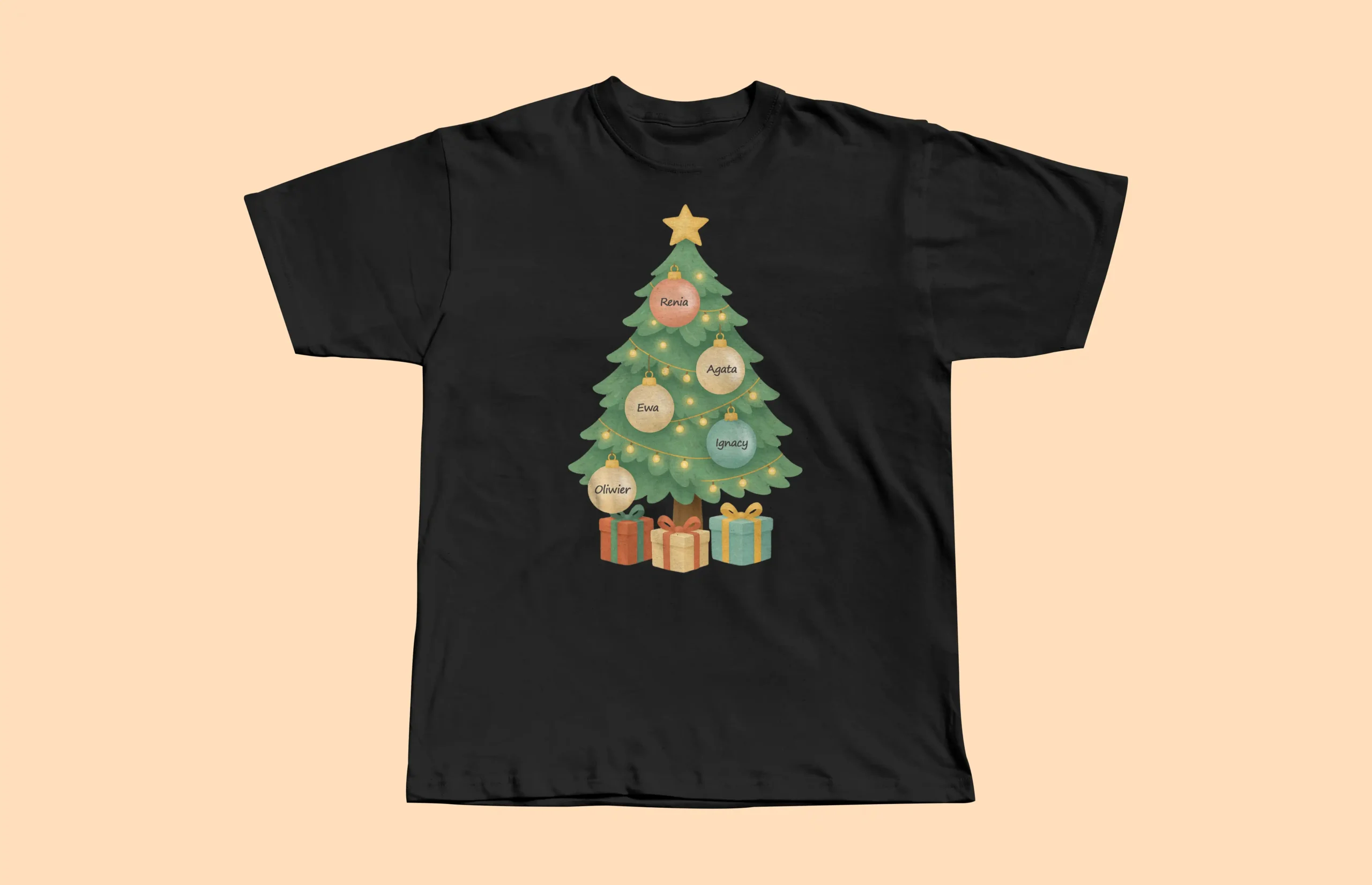 Ta personalizowana koszulka z choinką i imionami to prezent, który wywołuje uśmiech już przy pierwszym spojrzeniu — bo jest stworzona specjalnie dla Twojej rodziny 🎄💛
