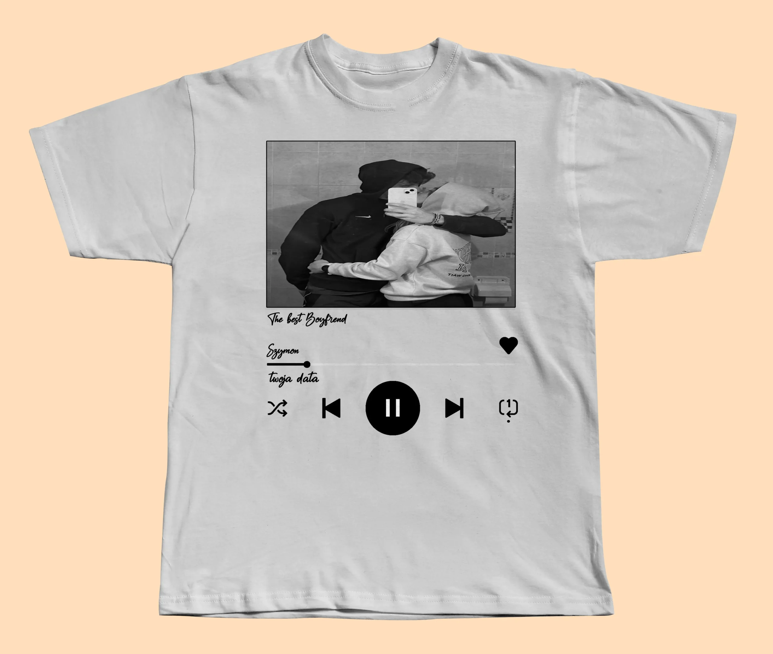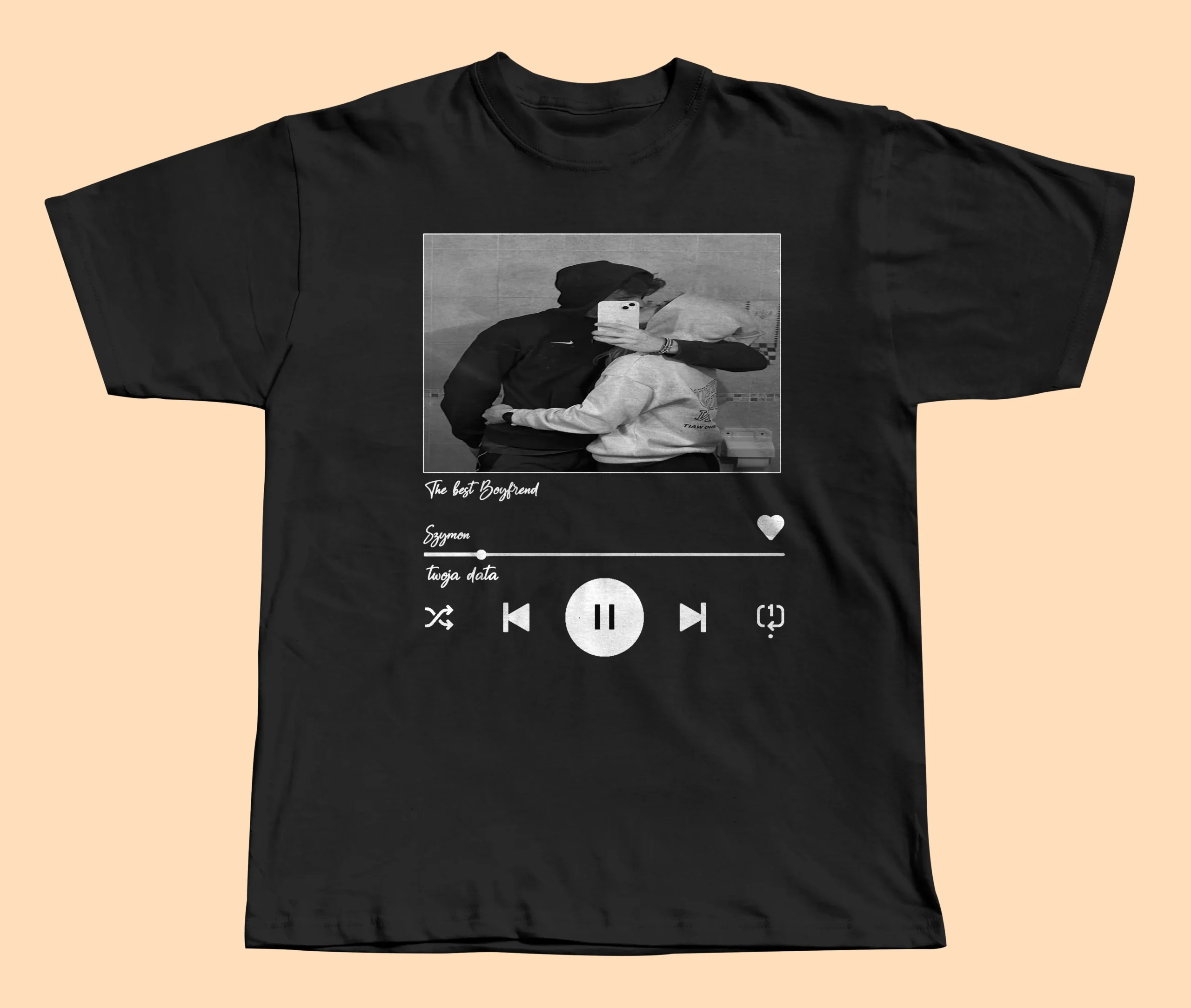 Ta personalizowana koszulka z motywem odtwarzacza muzyki pozwala zamknąć ważne wspomnienie w formie, którą można nosić. Dodaj własne zdjęcie, tytuł ulubionego utworu oraz datę, która ma dla Ciebie znaczenie — resztą zajmie się Szopik.