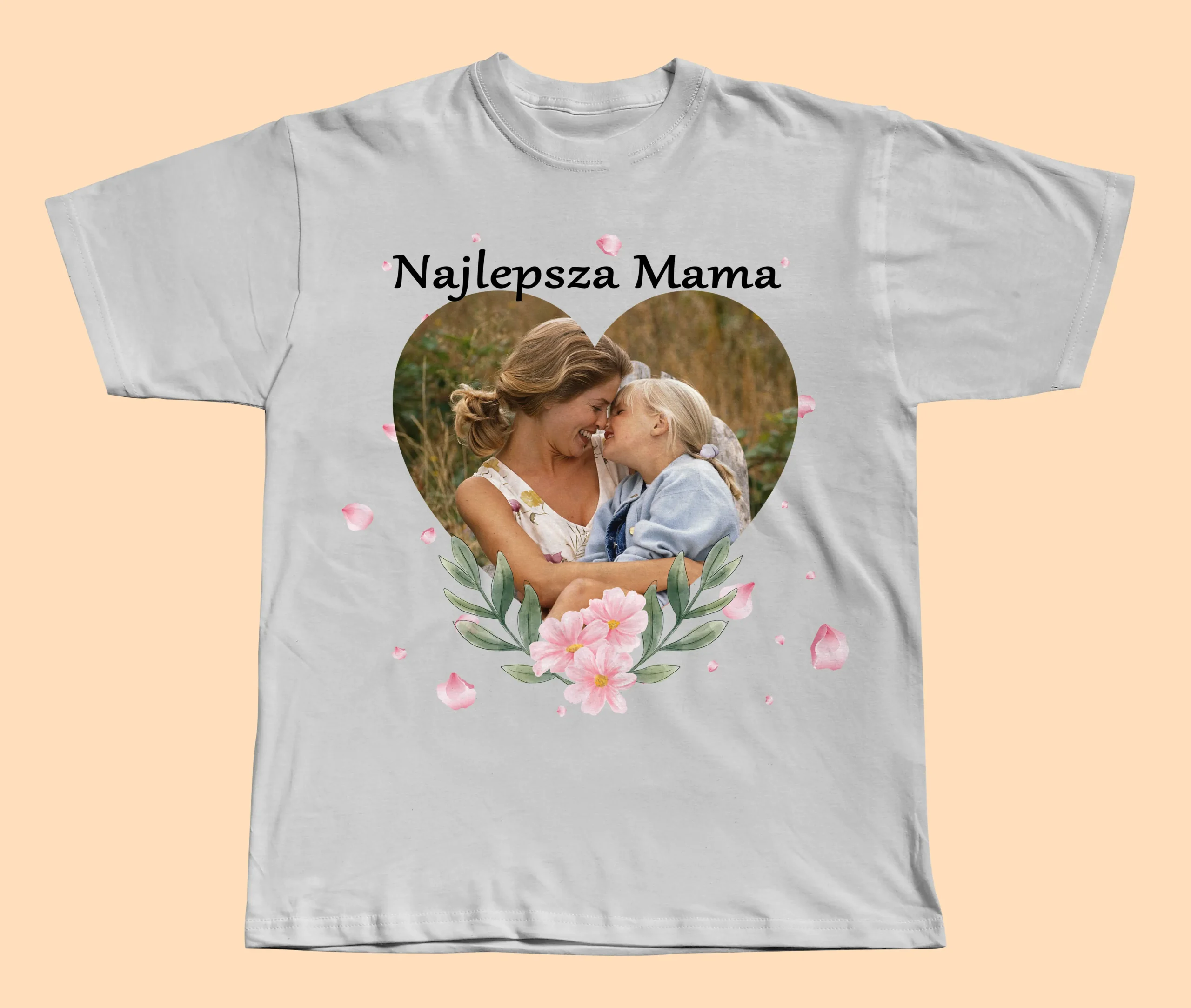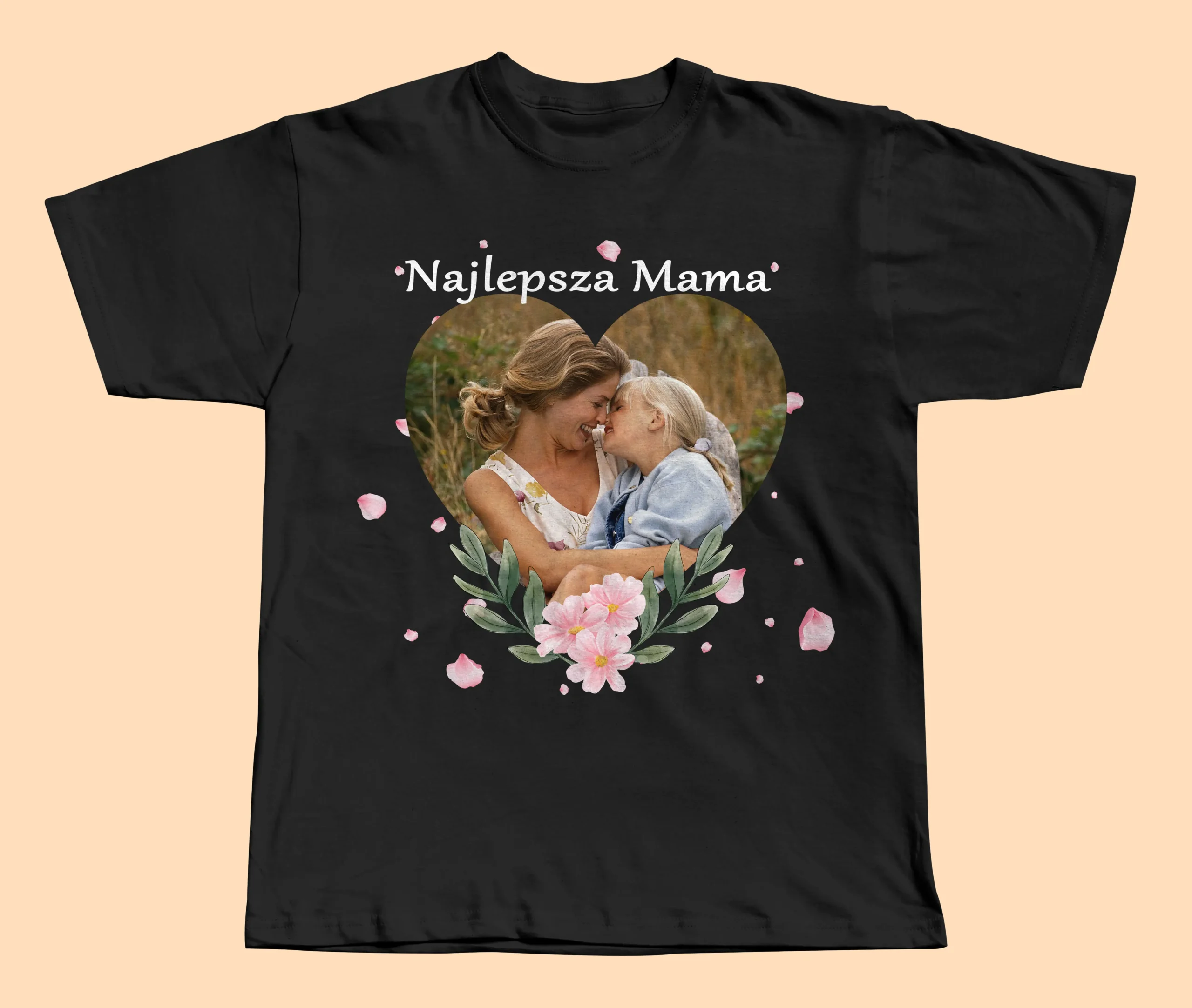 To spersonalizowana koszulka z napisem „Najlepsza Mama” i własnym zdjęciem, wykonywana indywidualnie na zamówienie przez Szopik Print.